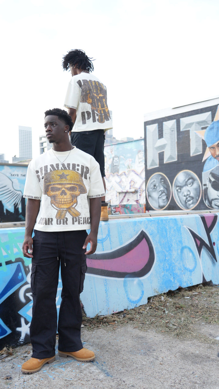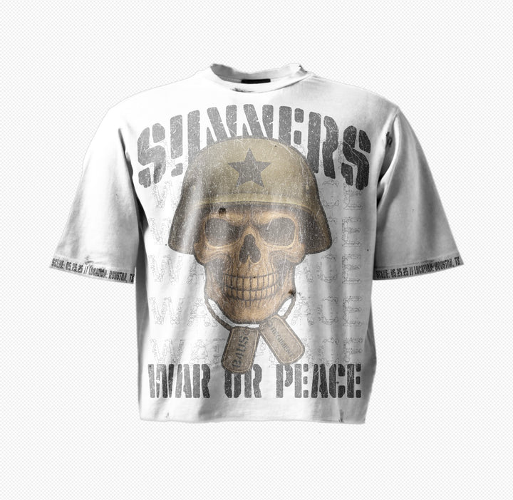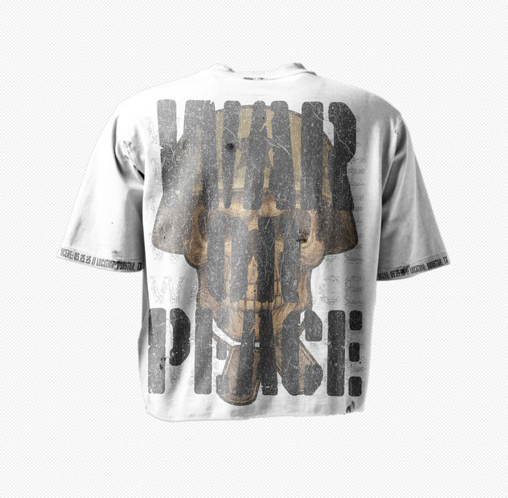 - Back graphic: Oversized “WAR OR PEACE” print layered over skull